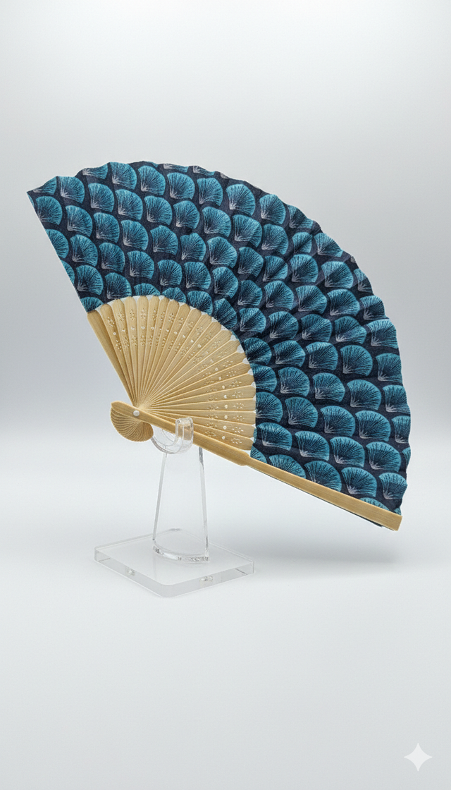 Eventail tissu et bois bleu