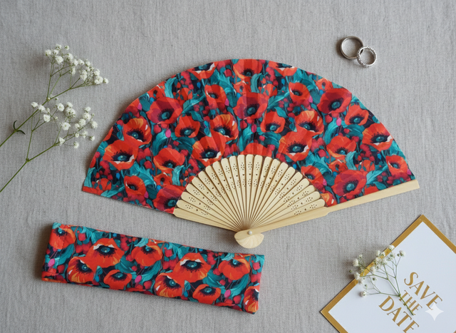 Eventail tissu motif fleurs coquelicots sur structure bois